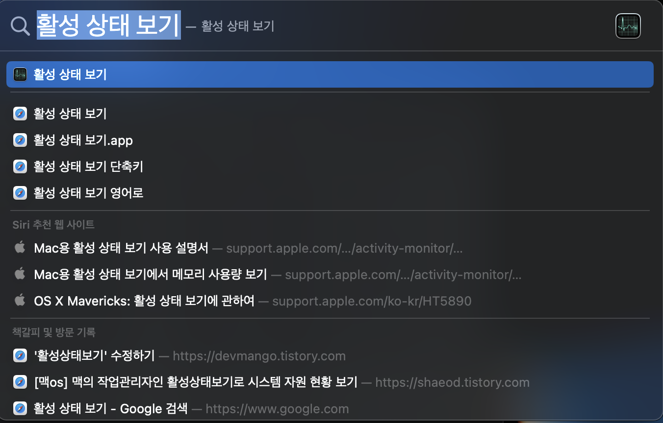 1. Spotlight에서 '활성상태보기'를 입력하여 활성상태보기를 열어준다.