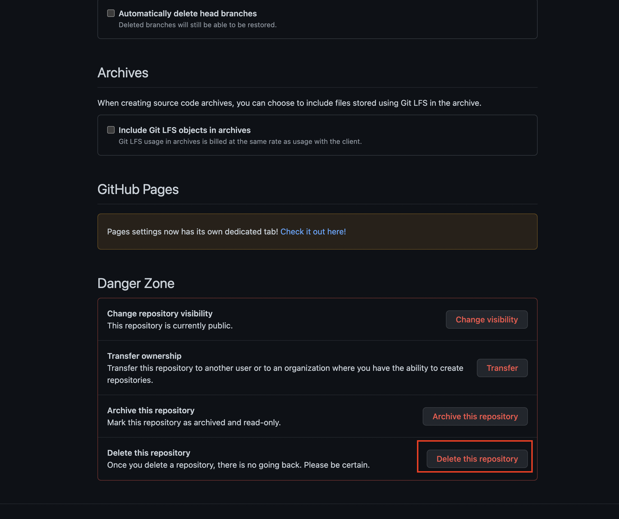 2. 화면 맨 아래에 Danger Zone에서 Delete this repository를 클릭한다.