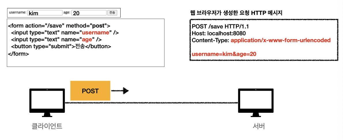 - form의 내용을 메시지 바디를 통해서 전송(key=value, 쿼리 파라미터 형식)