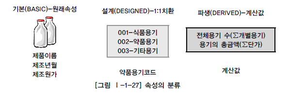 - 설계 속성 : 업무상 필요한 데이터 이외에 데이터 모델링을 위해, 업무를 규칙화하기 위해 속성을 새로 만들거나 변형하여 정의하는 속성. 일련번호와 같은 속성은 단일한 식별자를 부여하기 위해 모델 상에서 새로 정의하는 설계 속성